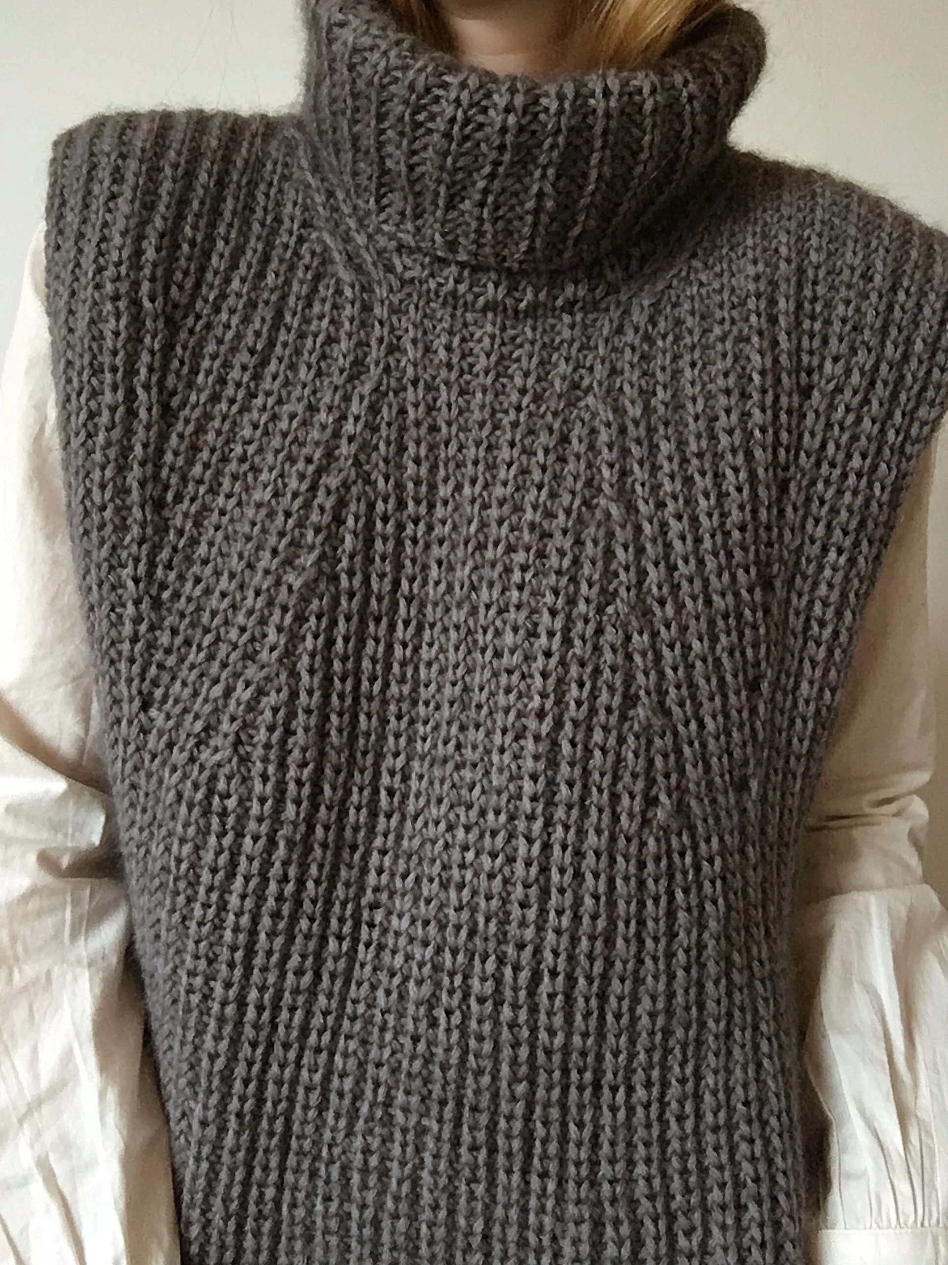 At first, you’ll knit the front and back. Thereafter the shoulders are joined. Finally, you pick up stitches along the neckline and knit the roll neck.
